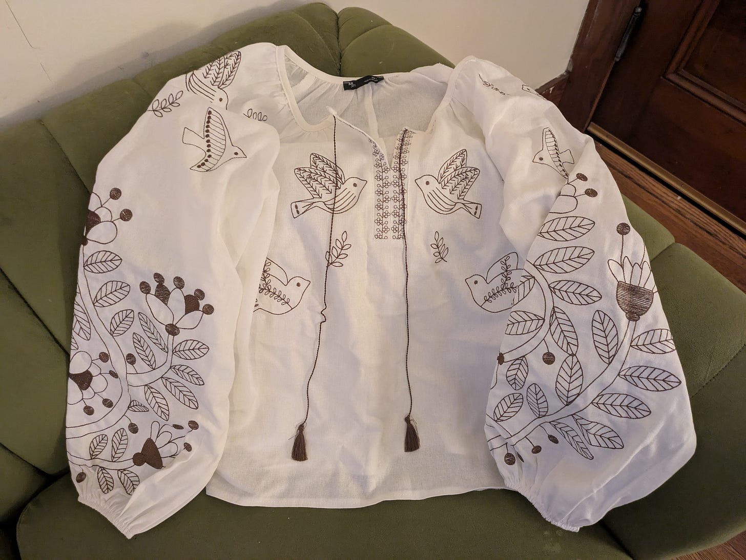 (Vyshyvanka are embroidered tops traditional to both Ukraine and Belarus. Traditional ones have unique patterns and colors for each region. Mine is not done in a particular traditional pattern, but it’s still so beautiful, isn’t it? I particularly love the doves; they remind me of why I went to Ukraine in the first place.)